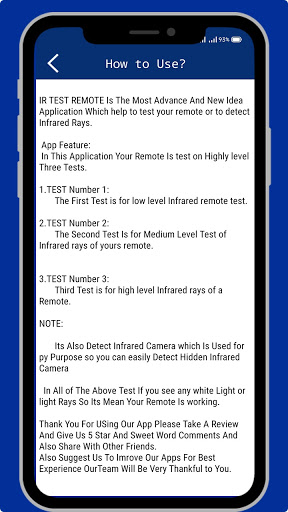Turn on the Remote Tester app After open of the IR Remote Tester app for android. Point the end of the remote control with the Infrared transmitter Press & hold one of the Button on the remote to Test. If the remote controls is sending a signal of IR Infrared ray, you should see a Light or white light in the of view finder cell phone or mobile screen when you press button on the Car Remote and light remote Mp3 remote Ac Remote laser remote Infrared Remote IR Remote App for Android. our app detected infrared camera which is emitted by tv remotes infra camera and other remotes our Remote testers and IR Remote Controllers feature shows you white bright light which is not visible with naked eye our special IR Infrared camera detection filter. which easily Detects Infrared rays e.g infrared remote rays also Infrared camera and Infrared lights which is not visible by naked eye.