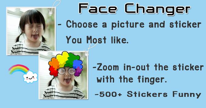 Face Changer and Face Look Changer Pro make funny to Enjoy Give your pictures a personal touch. to this amazing tool you will be able to create unique photos. Use this fantastic sticker app to bring a smile into your friends. Select a photo from your gallery and start personalizing by Choosing between numerous stickers funny. You will be spoiled for choice in selecting the coolest stickers, Eyes and Glasses, Mouth and Nose, Hats and Wigs, Text and Paint Features Make your friends laugh. Create delightful images of your friends with just one tap. This is a cool funny face make up app.