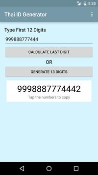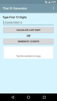 Registering on the website or online game might require 13-digit Thai National ID which has a verification code on the 13th digit. This app lets you 1. Generate Legit Thai National ID Number 2. Calculate the 13th digit on Thai National ID Number