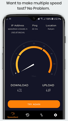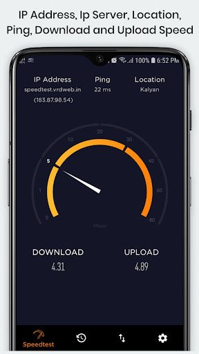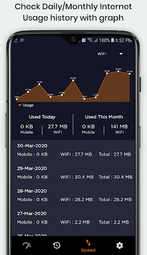 Check your internet speed with SpeedTest. - Internet Speed Test, - Instant Internet Speed on Status Bar - Daily/Monthly Internet Usage Stats (Wifi/Mobile), - Test History.