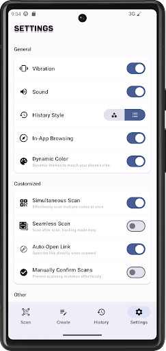 In addition to its powerful scanning capabilities, our scanner also offers a range of customization options, now with the dynamic color themes of Material You, to suit your preferences and make scanning even more enjoyable. And as an added bonus, our scanner allows you to easily create various types of barcodes and QR codes to fit your needs.