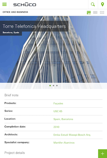 Together with its worldwide network of partners and architects, Schüco creates sustainable building envelopes. Schüco has now developed an App which provides you with inspiration and all the information you need about the industry. Browse through the international reference projects that interest you, receive a notification when you are near a Schüco project, or use the App during customer presentations.