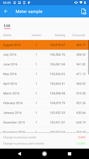 You can save a list of readings as a CSV file for further evaluations. Existing meter readings from previously used apps or from Excel can be imported via CSV file.