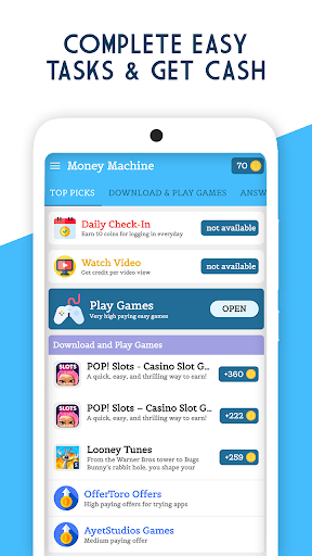 Money Machine free cash with completing the simplest task that are inside this make money online app, this free earning app is one of the top earning apps that helps to online earn money with just completion of simple task like watching videos, completing surveys, playing free games, testing free services, giving opinions, endorsements, free trials