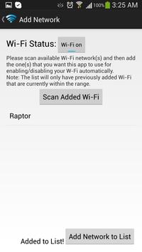 To use, simply tap on Add Network and Scan Added Wi-Fi, select the network that you want to add and then tap on Add Network to List and done! You can enable and disable services from preferences or completely turn the services off from status. If phone is switched on and off, please make sure you start AutoFi again, as the lifecycle of AutoFi only works after AutoFi is run.