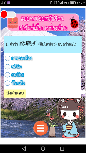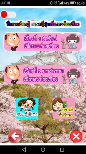 สื่อการเรียนรู้บน Smart Phone เรื่อง ภาษาญี่ปุ่นเพื่อการท่องเที่ยว มีทั้งหมด 2 เรื่อง คือ เรื่องที่ 1 คำศัพท์เพื่อการท่องเที่ยว และเรื่องที่ 2 บทสนทนาเพื่อการท่องเที่ยว และมีแบบทดสอบหลังเรียน