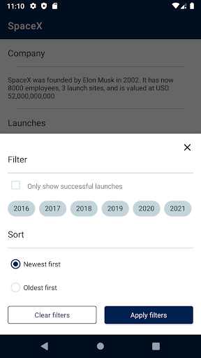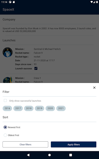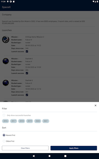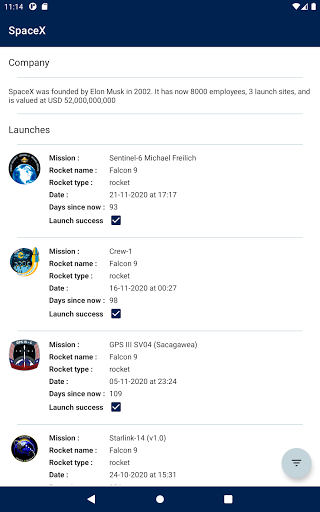 Not affiliated with Space X in any way shape or form, this is a Space X client that consumes the Space X API it is a project you can find on github to showcase good android architecture to perspective employers,