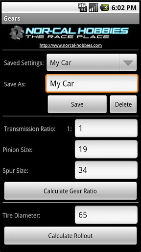 Nor-Cal Hobbies “Gears” app is an R/C car and truck gear ratio and rollout calculator. Enter the transmission ratio, spur, and pinion to generate a table of gear ratios. Enter the tire diameter to get a table of rollouts. Designed for the R/C car or truck racing nut looking for a super easy way to determine gearing on your Android phone right at your pit table. It'll run on phones with Android OS 2.0 and newer. And it is FREE!