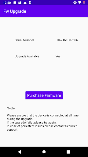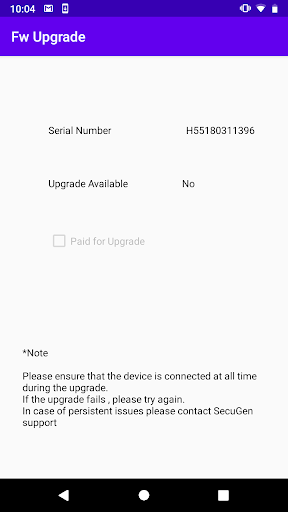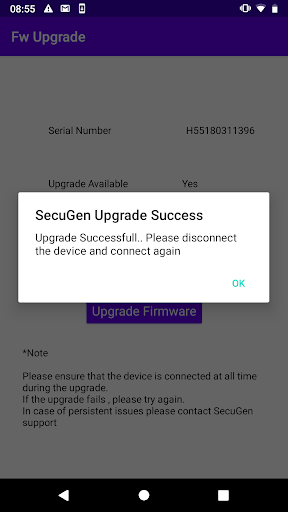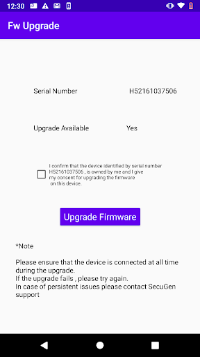 SecuGen Device Manger checks the firmware of your U20/HU20 device and provides the option of upgrade to a newer firmware, if an upgrade is available.