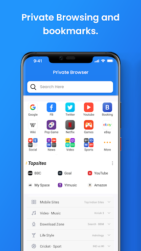 Private Browser: With Private browser, your internet surf will leave no traces behind. There is also Private Bookmark feature.