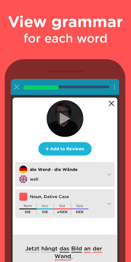 You've never seen vocab flashcards like these before. They combine video, speaking practice, and embedded grammar to create a fun and effective experience to learn German. This vocab learning feature is also a part of our free content, so you can start creating your own vocab lists and review your vocab regarding your needs.