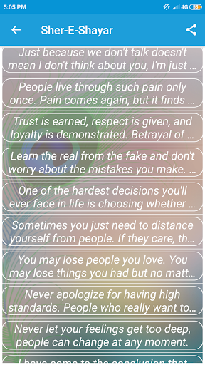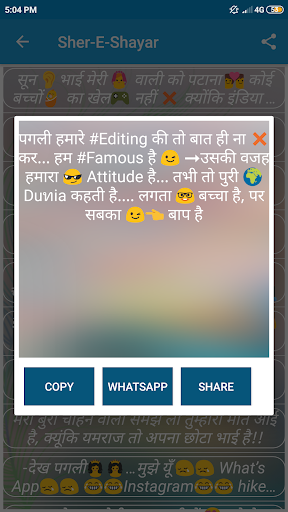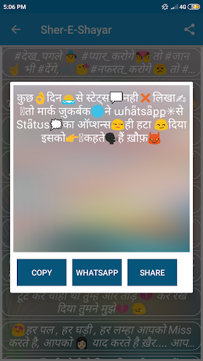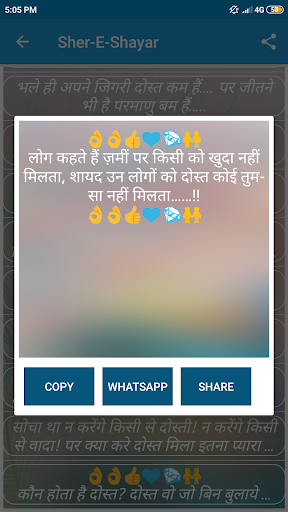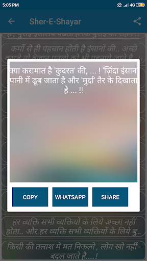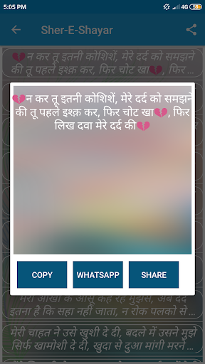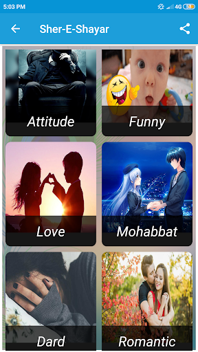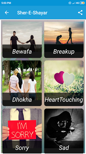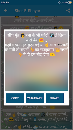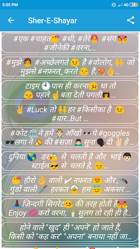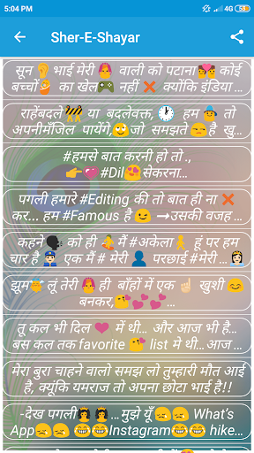 Thousands of heart rendering, touching Shayari's thoughtfully compiled in hundreds of easily accessible categories. This iys the best of all Shayari apps to impress your girl friends, boy friends & family with many funny Sher E shayari.