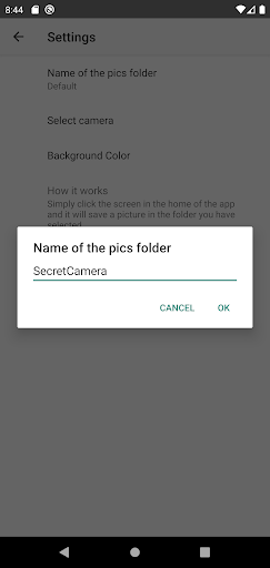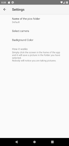 Simply click the screen in the home of the app and it will save a photo from your camera in the folder you have selected. Nobody will notice you are taking photos.