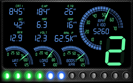 • Digital widgets for RPM, Speed, Engine coolant temperature, Intake Air temperature, Catalysts temperature, Engine Load, Turbo boost, Fuel Consumption, Clock, Fuel pump, Rail pressures (gauge and relative pressure) and Air/Fuel ratio, Mass Air Flow, Intake Manifold Air Pressure, Fuel Used, Fuel Cost, Voltage and others described below.