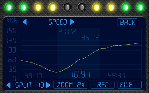 Configure and display six independent stopwatches with specific speed thresholds for your current and best acceleration. Display 1/4 mile, km DA times.