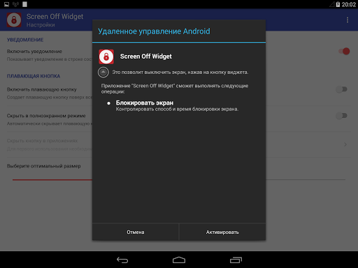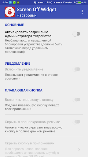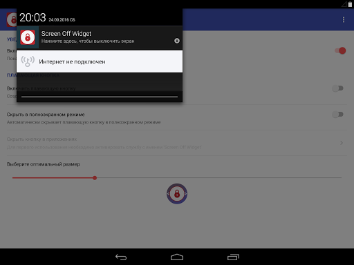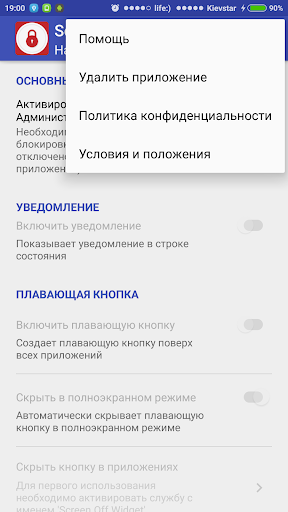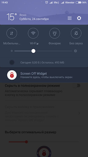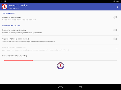 Create the floating button on top of other applications to always be able to quickly turn off the screen. Customize button at its discretion: