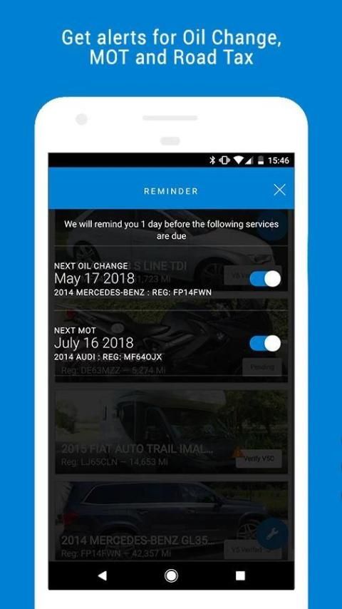 • Notifications- get Oil Change Reminders, MOT Reminders and Road Tax Reminders on the go