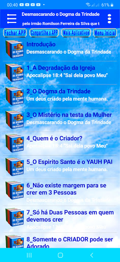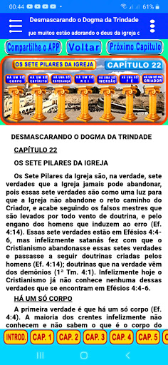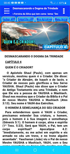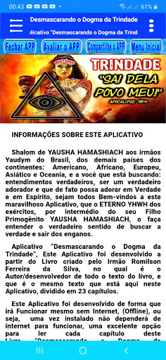 Приложение "Немаскировка Троицы Догма", это приложение было разработано из книги, созданной Brother Romilson Ferreira DA Сильва, в которой является автор / разработчик всего текста книги, и это тот же текст, который здесь, в этом приложении, разделен на 23 главы.
