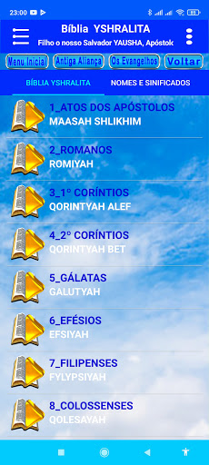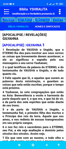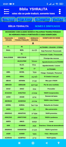 Esta aplicación contiene 2 traducciones/versiones: Biblias de Yshralita y Yaushalam, podrá leer la Biblia incluso sin Internet, tanto con nombres debidamente transliterados, sin perder la fonética que es universal, tanto en portugues y otros, la pronunciación fonética, Sigue siendo el mismo, también contiene alabanzas, capítulos y estudios hablados, tanto con la opción de fuera de línea, todo con la verdadera pronunciación fonética del nombre del creador más alto de toda la existencia y el hijo primogénito de la mayor que lleva a cabo la salvación, Ambos nombres transliterados a portugués, porque los nombres de las personas y los lugares no se traducen, es solo la transliteración de la pronunciación, que es traer el sonido fonético de cada letra y sin usar los asientos masoróticos hebreos, porque llegaron bien después de la llegada de la llegada de El Salvador a la Tierra.