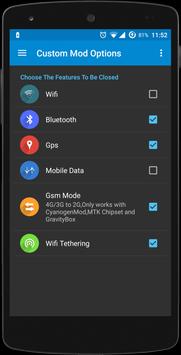 Application has 3 mode : Soft Power Saver(Wifi,Mobile Data,Bluetooth) - Hard Power Saver(All Features) - Custom Power Saver(Choose features from custom mode options)