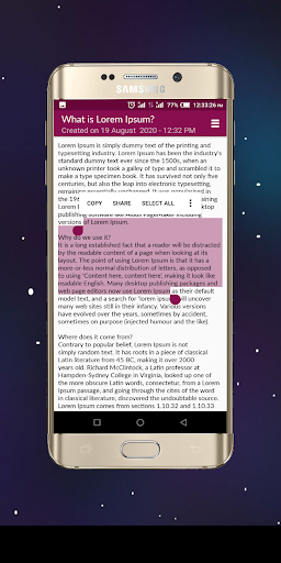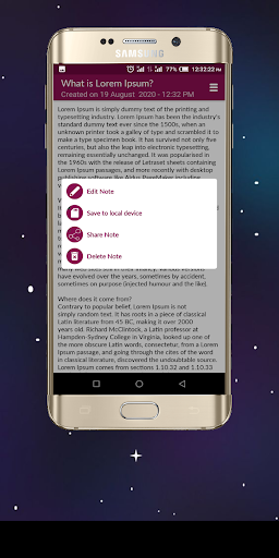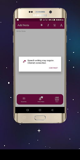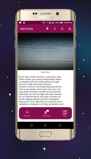 APP FEATURES Note-taking App with integrated features. -Type note -Scan typed docs to text -Voice note to text -Export note to local device storage for further editing -Easy to use with a well-explained tutorial.