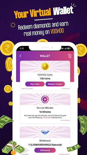 When your fans & viewers send you Gifts on VOOHOO, they get converted into Diamonds which can be redeemed into real cash to earn money hand over fist when you Live Stream or post content on the app