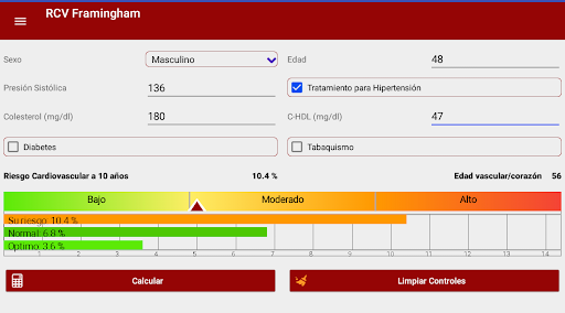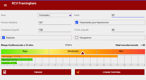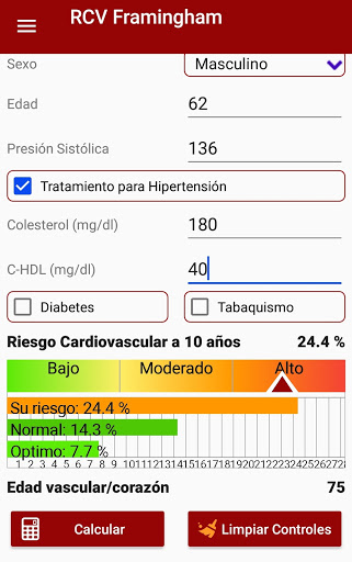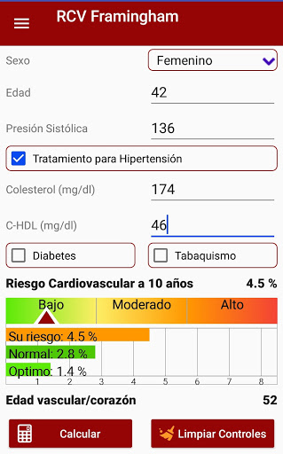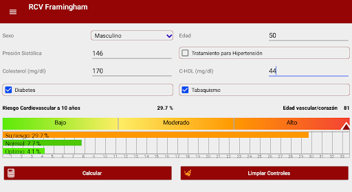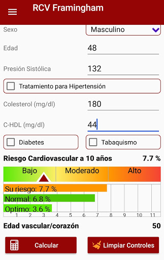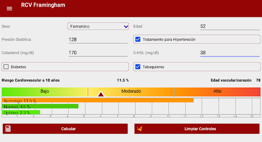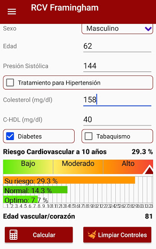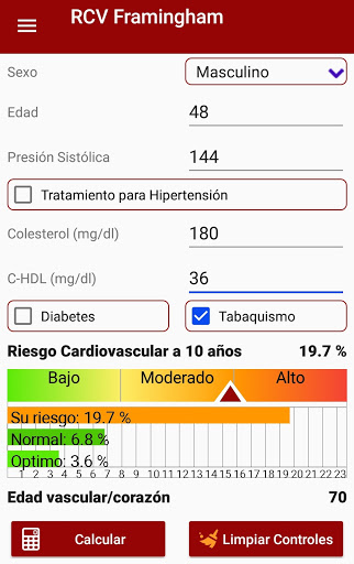 Calculator that allows health professionals to calculate the possibility of suffering a cardiovascular event in the following 10 years (myocardial infarction, angina, coronary disease, ischemic or hemorrhagic stroke); It is based on the Framingham Heart Study; for its use it is necessary to have cholesterol, HDL cholesterol and blood pressure values. It also allows the calculation of vascular age