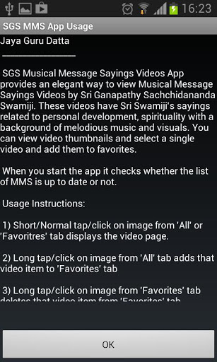 SGS Musical Message Sayings Videos App provides an elegant way to view Musical Message Sayings Videos by HIs Holiness Sri Ganapathy Sachchidananda Swamiji. These videos have Sri Swamiji's sayings related to personal development, spirituality with a background of melodious music and visuals. You can view video thumbnails and select a single video and add them to favorites. You can also share the videos via Email. The app also pops up an occasional quiz on these quotes to keep things interesting.