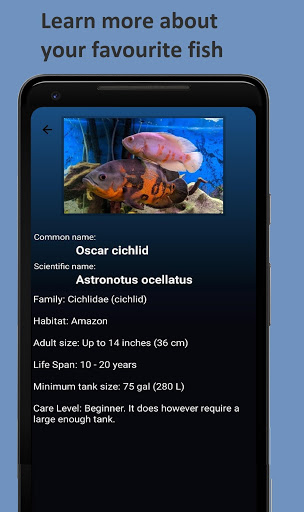 FishYI uses AI deep learning to identify your freshwater and saltwater aquarium fish by simply choosing a picture, or taking a picture with your camera.A care sheet is displayed for each fish, helping you to provide the best home for your pet buddies.