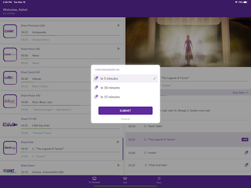 - Start-Over / Time shift: Use the pause, reverse, and forward-to-go functions of the current transmission; Select backward to the exact moment of the watched transmission.