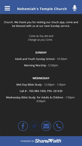Welcome to the official Nehemiah’s Temple Church app. Download the app to stay up-to-date with the latest events, newest sermons, and all the happenings at Nehemiah’s Temple. We minister to the Metro Detroit area in Warren, Michigan. To live stream or watch the latest sermons, click the Live Stream tab or Past Sermons. If you would like to make a donation, click the Donate tab. For more information about Nehemiah’s Temple Church, clink the More Tab, then Nehemiah's Temple Website.