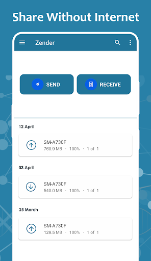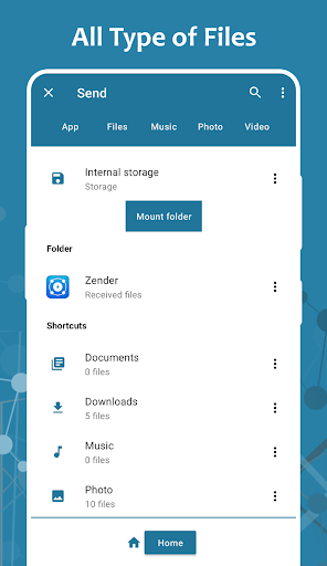Zender - Fastest File Transfer & Sharing App 📥📤 helps you transfer or share photos, videos, music, apps, games and all type of files you need in a few clicks. Through Zender fast transferring app you can transfer different types of files and sizes between mobile devices.