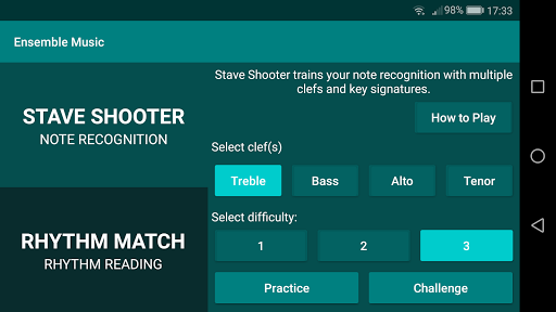 - Stave Shooter trains your note recognition with up to four clefs and randomly selected key signatures.