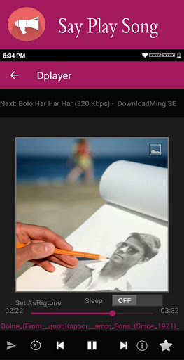 Main screen of application. Play Screen of an application gives various options such as Share a Songs , Shuffle, Repeat ,Set as Ringtone ,Set Sleep time and Add to Favourites,Name of Next Songs