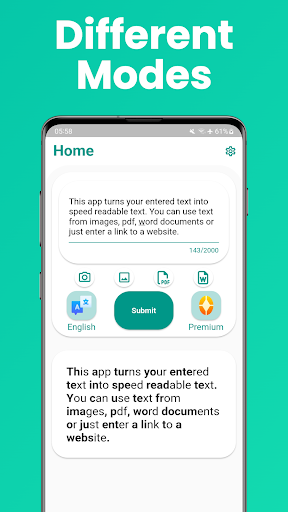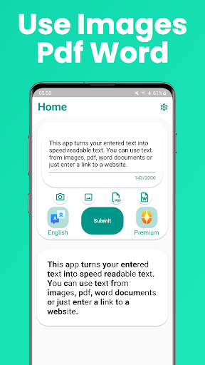 With this speed reading app you can turn every text into speed readable text. Speed read in all languages with latin letters. Use this speed reader for speed reading pdf, word and text from images. Fast reading was never so simple.