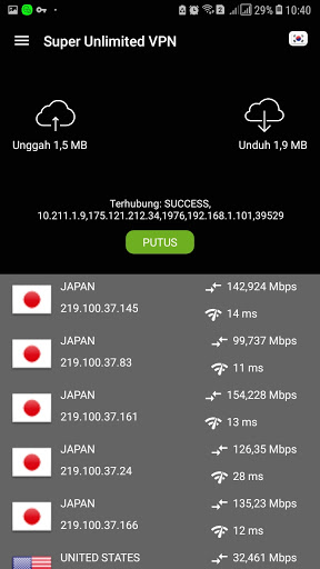 Super Unlimited VPN memiliki jaringan VPN global, seperti, Amerika, Inggris, Prancis, Jerman, Singapura, Jepang, Korea, dll. Semua server proxy GRATIS untuk digunakan, cukup klik bendera dan ubah server yang Anda inginkan.