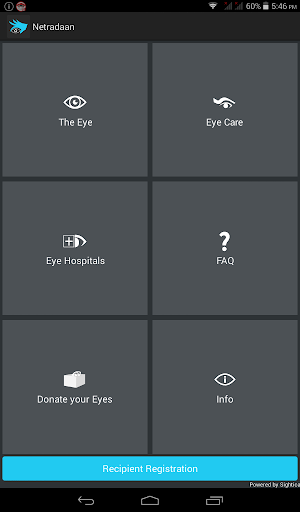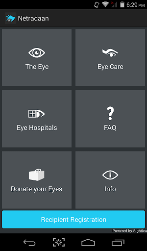 The App has a Registration section where an user can register as a 'Donor' or as a 'Recipient'. The Registrant receives followup details from the Eye Bank Association of India which Sightica Solutions (www.sightica.com) partners with in regard to Eye/ Cornea Donation.