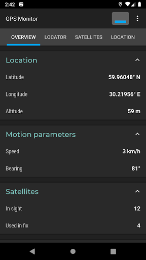"Overview" tab contains information about a state of navigation system: longitude, latitude, altitude, bearing and speed.