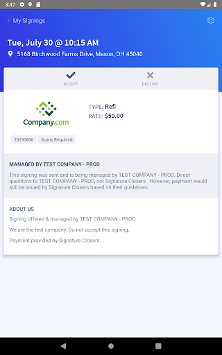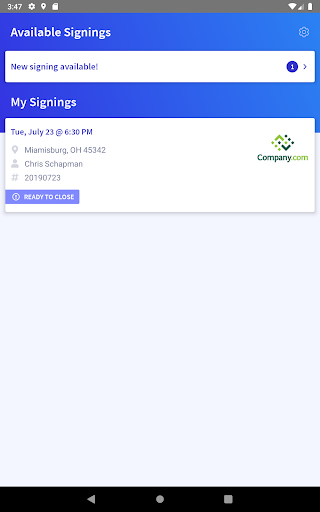 Receive and accept signing requests from Signature Closers using your phone. View the signings you have with Signature Closers, see which signings have documents ready, and (if applicable) quickly call or email the signers to confirm the appointment from within the app. When finished, close out the signing while walking to your car.