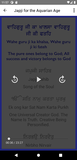 For the first time, with this Version 2.0 of the app, users can “Select Language” to select either English or Spanish. And the app will display in either Vertical or Horizontal device orientation. You can also “Select Audio” with three possible audio recordings of kirtan artists, Snatam Kaur, Nirinjan Kaur or Sada Sat Simran Singh. These recordings have very authentic and accurate pronunciation. Each audio is at a different slow, medium or fast pace. The slow audio will be perfect to learn Japji. The medium is for the intermediate reader and the fast audio is perfect if you are very familiar with Japji. You can also choose to “Disable Audio” so as to read Japji at your own pace. With “Select Language” you can also choose to display the words in Gurmukhi, or transliteration, or the translation – both available for English and Spanish. You can choose to display one or all three of these options and in the “Settings” you can select four different sizes of the text. There is a “Daily Reminder” function to set a timer to remind you when you want to read Japji each day. Another feature is that you can choose to read along with the “Repeat Paurees 11x”, choosing any of the 40s sections of Japji to repeat 11 times. This app also has all the words for the Aquarian Sadhana mantras that you can read along with in any darkened room as your device screen is illuminated. In Japji Sahib Guru Nanak touches the deepest essence of individual consciousness, elevating one to the universal consciousness. The reciting of Japji aloud transforms through the powerful Naad vibration of these sounds. Recite it, connect to it and feel the power of it like never before!