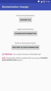 Simple app that change bootanimation, it needs root! You mustn't choose flashable zip.