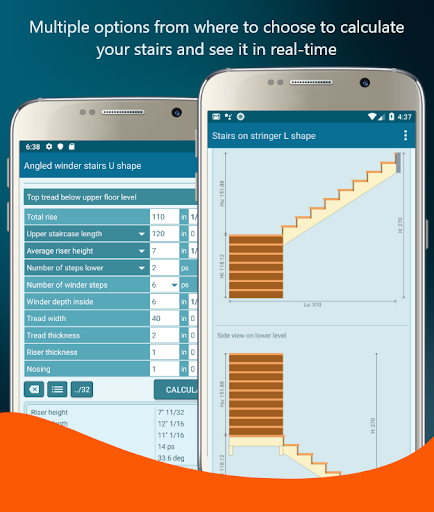 Calculate treads depth, rise height, number of steps, length of stringer and angle fast and easy.