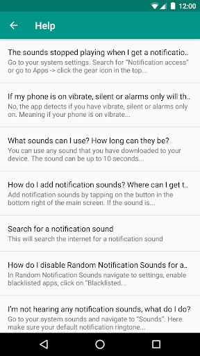 How does it work? When you get a notification, the app will randomly choose between however many notification sounds you have selected. You can add any sound file you'd like, simply download the notification sound and from the app select it, as easy as that! Want an app to be separate from random notifications? Simply go to settings and blacklist the app, now that app will use its notification sounds or whatever you have set for that app! If your phone is on silent, vibrate, etc. the app will automatically recognize this and turn off the random sounds accordingly to not disturb you. (In android lollipop and higher) Respects notification priority meaning if you have priority notification sounds only on the app will only make notification sounds for apps that have notification priority.