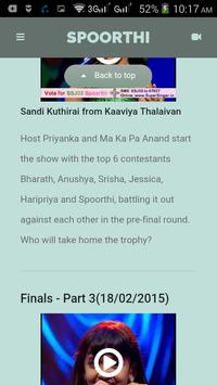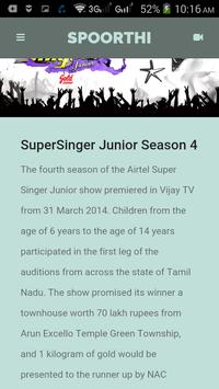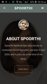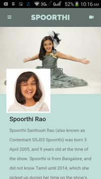 Spoorthi Santhosh Rao (also known as Contestant SSJ03 Spoorthi) was born 3 April 2005, and 9 years old at the time of the show. Spoorthi is from Bangalore, and did not know Tamil until 2014, which she picked up during her time on the show's studio set.