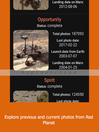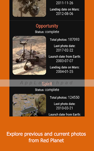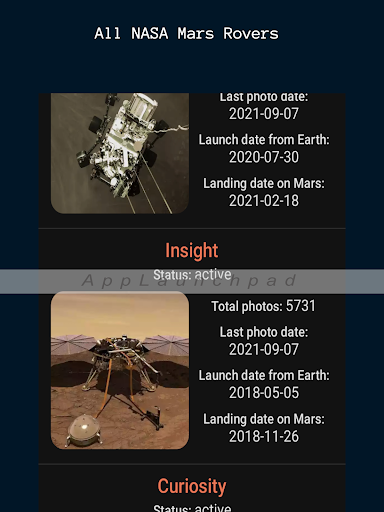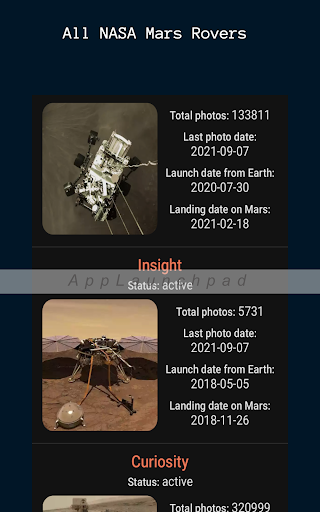 Photos which were taken during Nasa Mars mission from rovers: Perseverance, Insight, Curiosity, Opportunity, Spirit in the one application!
