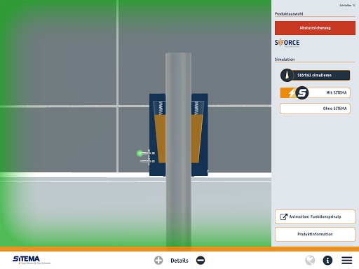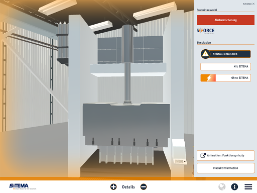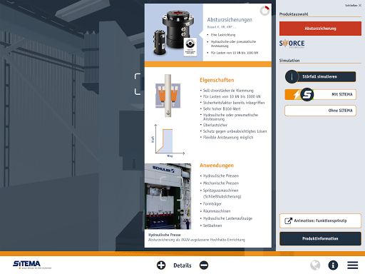 SITEMA Clamping Heads are mainly used to secure machines. In this 3D app, you can discover some typical examples for the use of our Clamping Heads and can try virtually how machines behave with and without Clamping Head in case of an emergency. The app is meant for designers and deciders to learn more about the functioning of our Clamping Heads and demonstrate their function in some typical machines. It is also meant to inspire you how safety and functionality of machines can be improved in an intelligent way.
