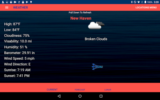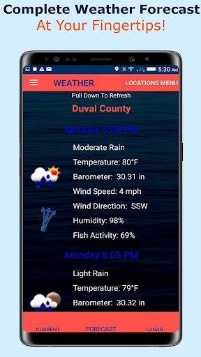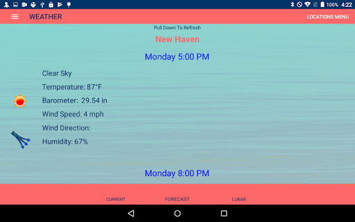 The CURRENT tab displays the current weather in either standard or metric, depending on what you've chosen on the settings page. Notice the WIND DIRECTION INDICATOR, the same one you'll see on your FISHING LOCATION page. By tapping the DOWN ARROW in the upper right corner, you can choose which location you'd like the weather to show.