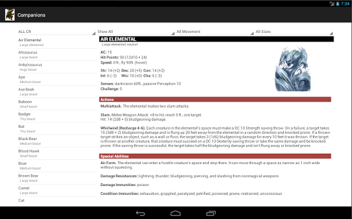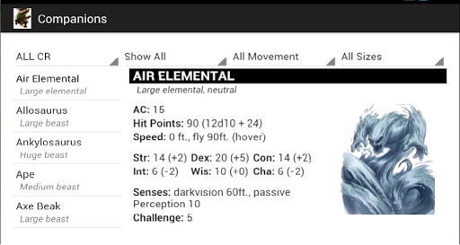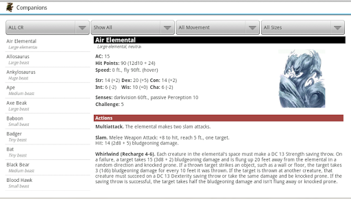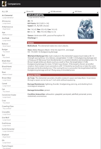 Reference guide with full stats and info for: Druid Wild Shape forms Beastmaster Ranger Companions Familiars Sort list by challenge rating, type, size, and movement type.