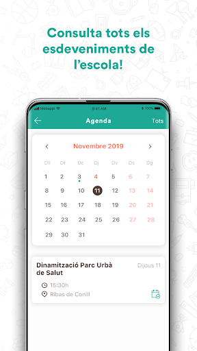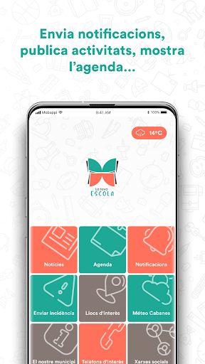Приложение, которое вы найдете следующее содержимое: новости;расписание;Раздел с социальными сетями, доступными в школу;Пространство интересных мест (библиотеки, Ludotecas, ...);школьная информация;Отдельный из уведомлений и пространства для отправки задач.