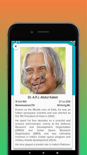 When user launches any category, they see a card. This card contains a picture with header information such as name, place/date of birth, place/date of death. It also displays important information about that personality in short bullet points easy for user to pars and absorb.